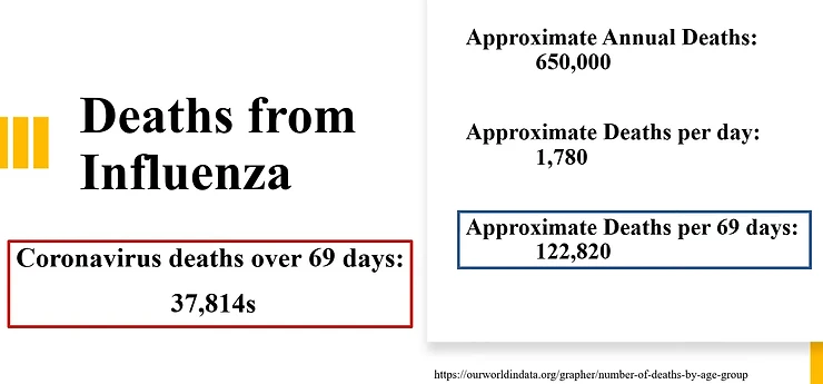 Wat vaak vergeten wordt bij vergelijking met de gewone griep is dat griep wordt gezien als onschuldig virusje terwijl er toch vele mensen dood aan gaan. In Nederland is dat jaarlijks minimaal 2.000 doden. Alle doden hier boven noemt met oversterfte. De oversterfte in Nederland in de winterperiode 2017-2018 was 9.400 doden. Totaal dus 11.400 griepdoden in die periode.
