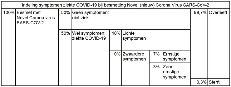 Van de 50% mensen die wel ziek worden (en dus de ziekte COVID-19 krijgen) heeft 80% (dus 40% van het totaal aantal besmette mensen) milde klachten, vergelijkbaar met een verkoudheid of griepje. Veel van hen hebben helemaal geen verhoging of koorts. Bij 20% (10% van het aantal besmette mensen) is het wat ernstiger. Zo’n 14% (7% totaal) heeft ernstige klachten en 6% (3% van totaal) zeer ernstig waarvan een klein deel overlijdt.