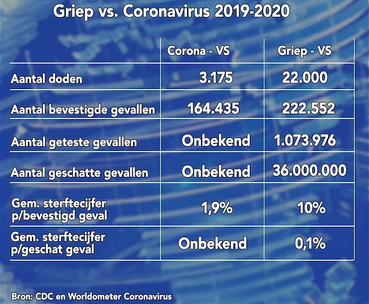 Het sterfcijfer van 0,1% van griep is overigens niet op basis van bevestigde gevallen maar op basis van het totaal aantal geschatte mensen dat griep heeft. Kijk je daarna dan krijg je een verrassend beeld. Bijvoorbeeld in de VS een sterfcijfer van 1,9% voor Corona en 10% voor griep.