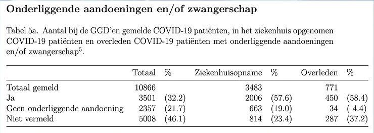 Ook in Nederland zien we vergelijkbare gevallen als in Italië. Van 4,4% van de doden in Nederland is bekend dat ze geen onderliggende aandoening hadden. 58,4% daarvan was bekend dat zij onderliggende aandoening(en) hadden. Van 34% was dit niet bekend (waar afgaande op de cijfers van Italië wel aannemelijk).