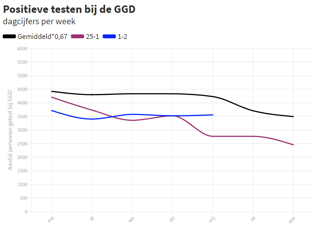 Als u naar de zwarte lijn kijkt, dan is dat het patroon zoals we het per dag hebben gezien in het vierde kwartaal 2020 tot Kerst . Een vrijwel stabiel aantal positief getesten van maandag tot en met vrijdag en een daling van bijna 20% in het weekend.