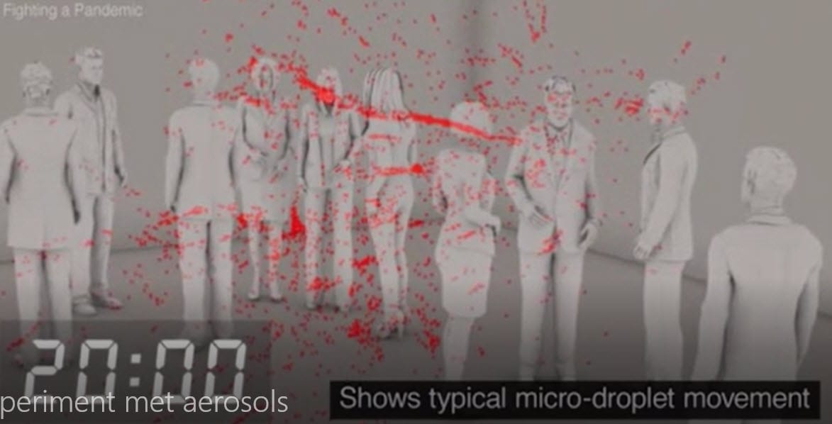 Men heeft via o.a. een hoge snelheids-camera zichtbaar gemaakt wat er gebeurt bij niezen en praten. Naast grotere druppels, die inderdaad niet verder komen dan een meter of zo, komen er ook veel kleinere elementen naar buiten, die worden micro droplets (aerosolen) genoemd. Die kunnen lang blijven hangen en als het ware gaan zweven. Dit is de situatie, zoals de video weergeeft, na 20 minuten in een gesloten ruimte.